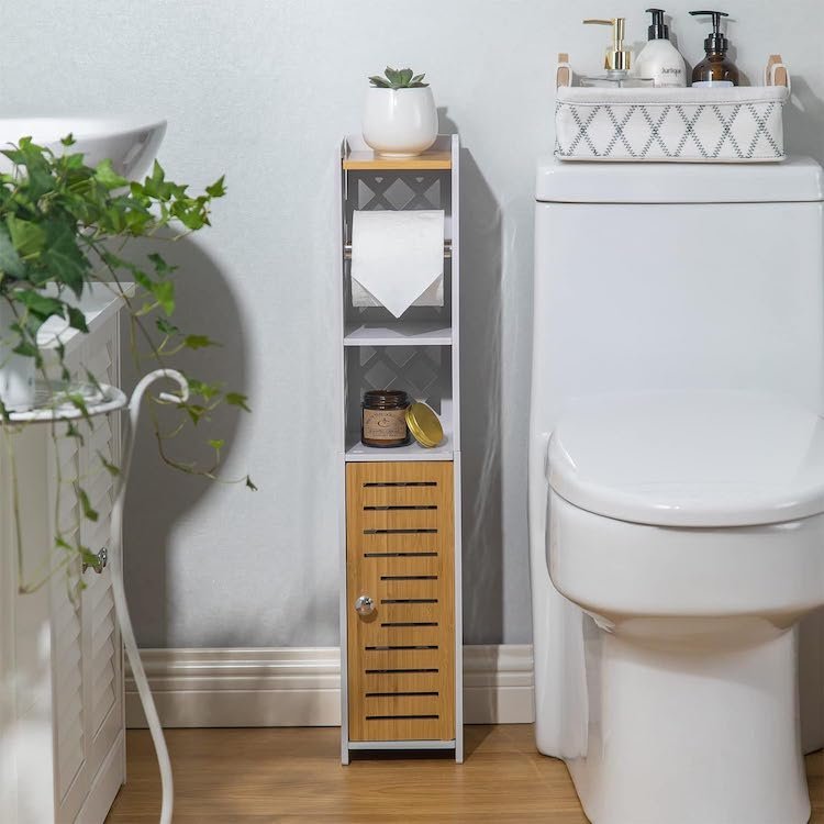 Sick of storing your toilet paper far away from where you need it most? This slim cabinet fits into even the tiniest places, providing you with both a toilet paper stand and storage. There’s even a small shelf inside to fit a candle or spray, for those…ahem…longer bathroom trips.Â