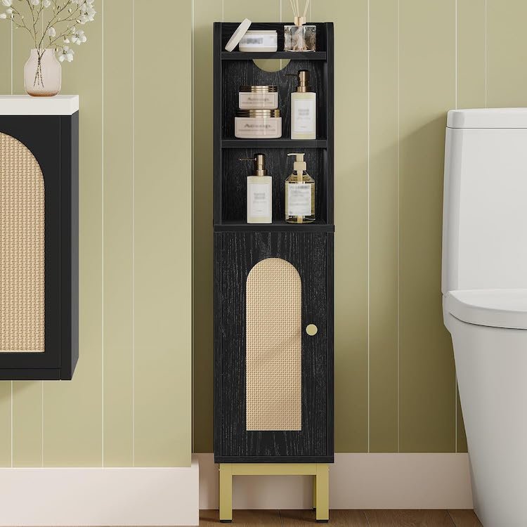 Another choice that is ideal for compact or narrow spaces, this modern cabinet gives you storage options in an ultra-chic package. Adjustable shelving allows you to store a wide range of unsightly bathroom products, while classy gold hardware makes it feel oh-so-expensive. They don’t need to know it was easy on the bank account.