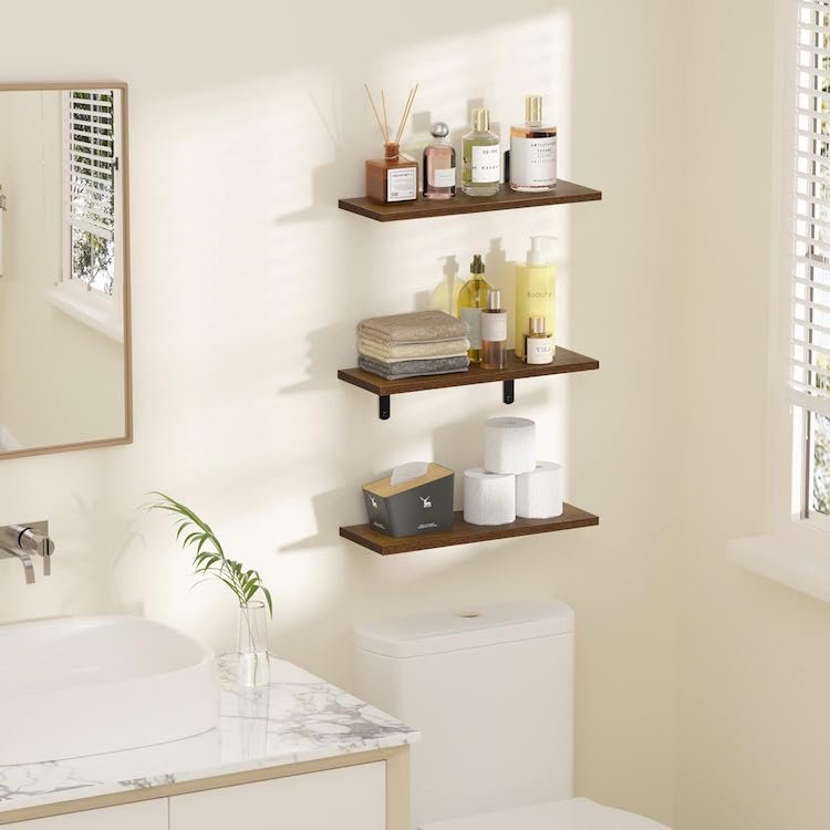 This set of three floating wall shelves can be hung anywhere, for a space-saving solution to more storage. Strong enough to hold up to 20 lbs, they’re the answer to cluttered cabinets or piles of towels. Place them above the toilet for easy-to-reach items or use them near your bathtub as a convenient place to store shampoo and body wash. The options are endless!
