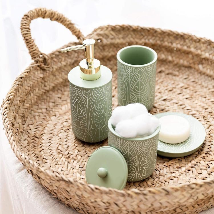 This four piece bathroom set comes with everything you need to add a boho touch to your bathroom decor: toothbrush holder, canister, soap dispenser and dish. Made from resin clay, these green bathroom accessories are hand-engraved and individually painted by artisans!