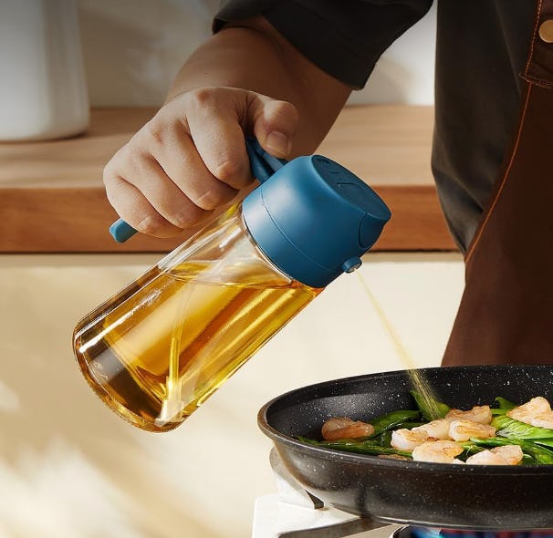 You can stop buying cooking spray when you get this amazing two-in-one cooking oil dispenser. The lid has a no-drip spout, plus a spray nozzle and an easy-to-grip handle. And the container is made from thick and durable glass that allows you to see the contents and makes for effortless maintenance — just pop it into the dishwasher.