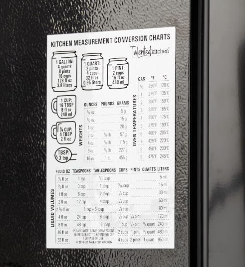 Magnetize this measuring conversion chart to your fridge so you can access it any time you need it for reference. It covers the most common measurement conversions, including liquid volumes, weights, temperatures, and more. And the vinyl that it’s made from is durable to last.