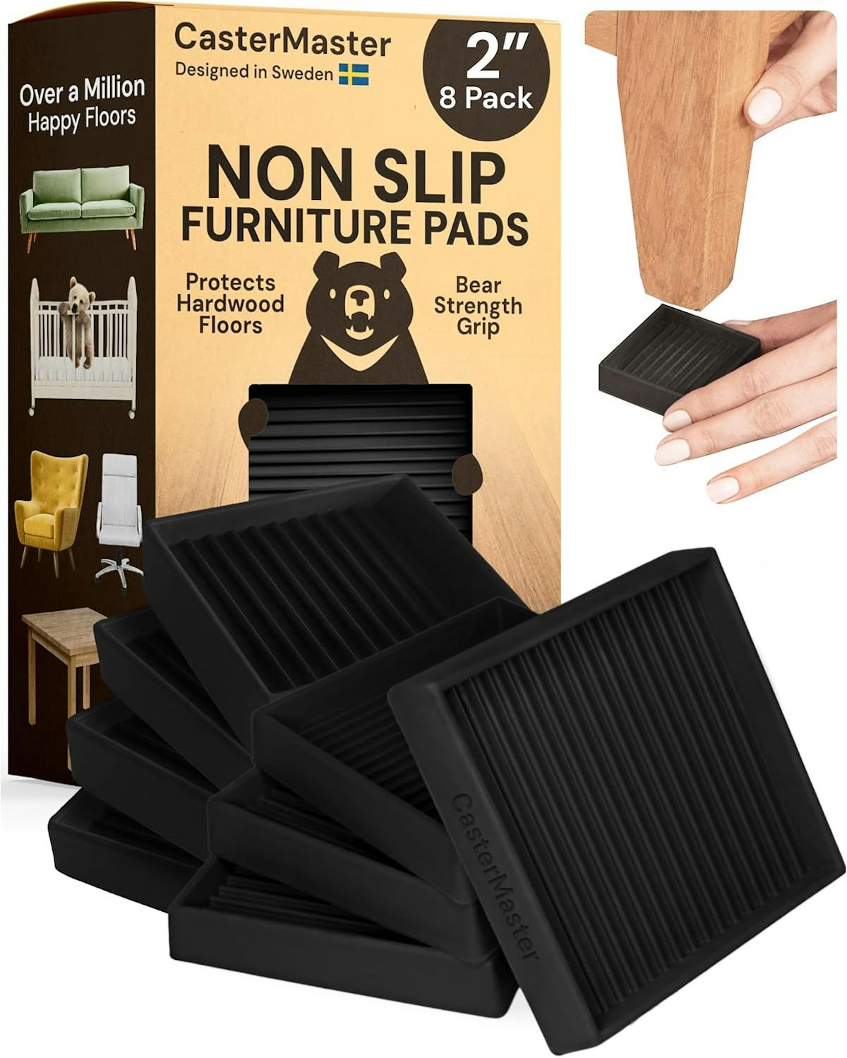 CasterMaster Non Slip Furniture Pads – Square Rubber Anti Skid Caster Cups Leg Coasters – Couch, Chair, Feet, and Bed Stoppers with Anti – Sliding Floor Grip (Set of 4) (2” x 2″ (Set of 8), Black)