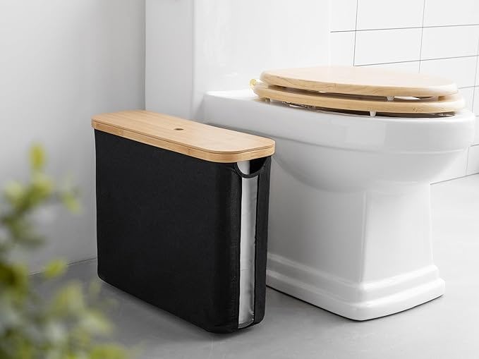Keep extra TP within reach without creating an eyesore in your bathroom when you use this sleek toilet paper storage basket. The collapsible design is made from a durable fabric with a narrow, clear view side so you can see when you’re running low. And the bamboo lid keeps rolls out of view while adding a stylish touch. Store up to 12 standard rolls or nine jumbo rolls.