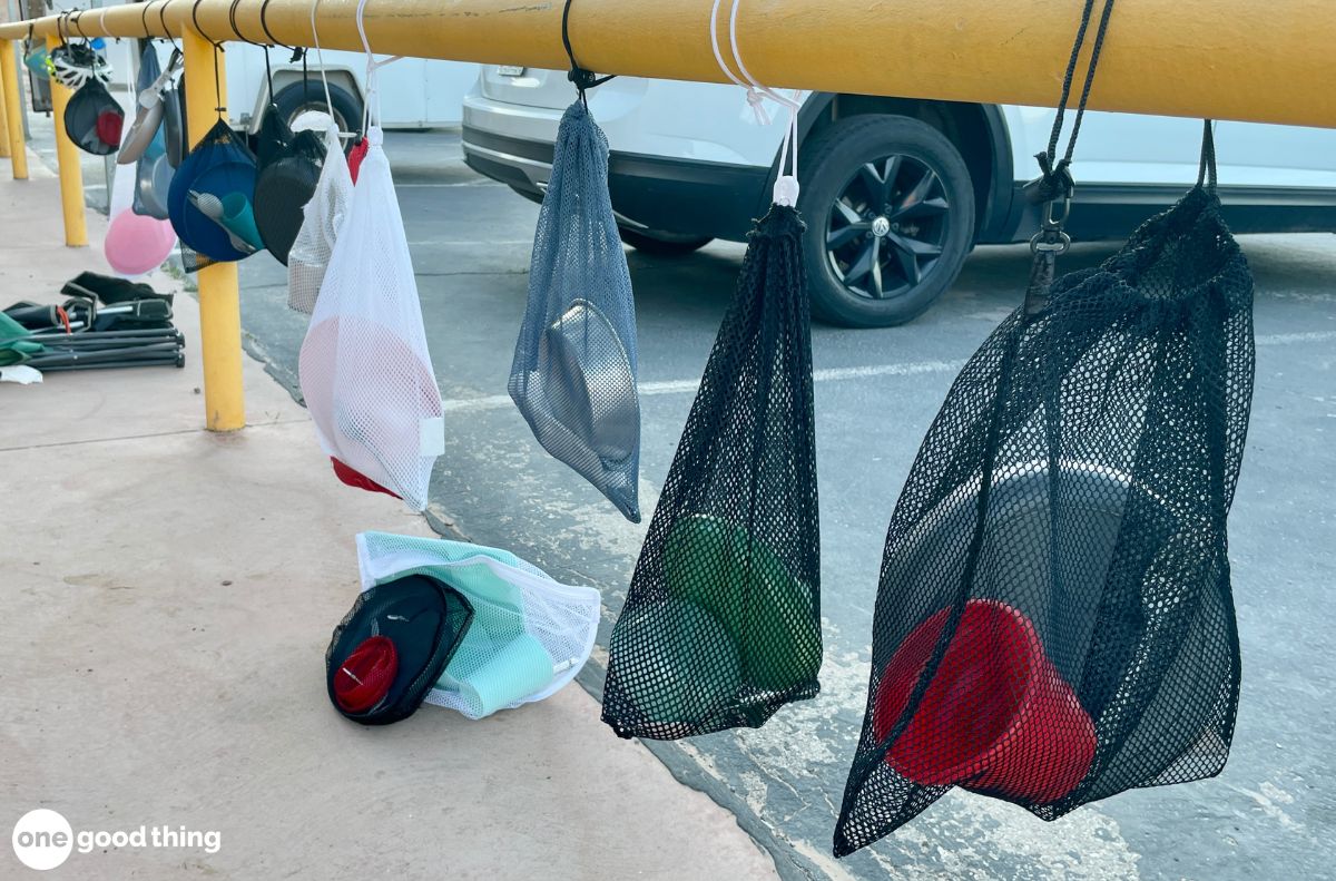 Use mesh bags to dry dishes outdoors while camping, saving space and time.